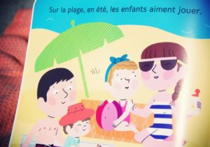 A partir de 2 ans • Un imagier à faire soi-même à 2 ans ? Mais oui c’est possible ! Les pages centrales sont composées d’une partie de gros stickers à placer sur les bonnes silhouettes pour compléter une page (comme le parasol pour protéger la petite famille du soleil) et d’autres petits stickers à placer où bon leur semble pour décorer les pages : une étoile de mer par-ci, un petit garçon avec une épuisette par-là, un dauphin, etc…