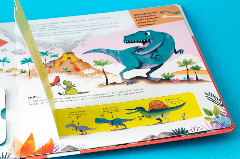 Plein de petites infos et anecdotes rigolotes sont disséminés dans les pages: on apprend ainsi que le caca d’un brachiosaurus fait la taille d’une petite voiture, que tyrannosaureus rex (T-Rex) signifie « tyran des lézards-rois » et qu’ils boulottaient l’équivalent de 1500 saucisses par jour, ou encore que les ptérosaurus avaient des poils et pas des plumes, qu’ils volaient et pouvaient atteindre 15m d’envergure (une chauve-souris géante quoi).