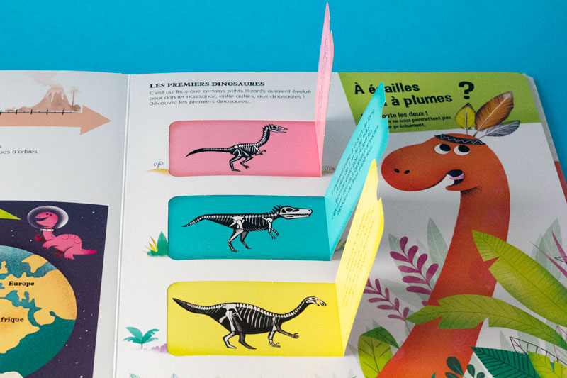 Entre flaps (rabats) à soulever et roues à tourner, les enfants découvrent l’univers des dinos à travers les trois grandes périodes. Les illustrations sont très colorées et les têtes des dinos sont vraiment marrantes. J’ai un faible pour le l’archeopteryx, sorte de gros pigeon à plumes avec une tronche de dino et des pattes d’oiseau. Il est parfaitement ridicule.
