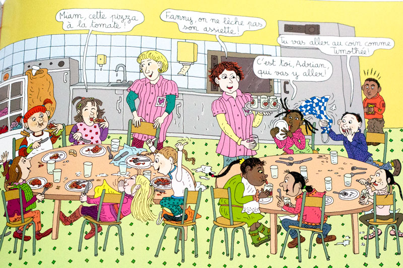 Cette fois, Bernadette Després met la pointe de son crayon au service des petits nouveaux de l’école maternelle. Elle propose des instantanés de scène de vie ordinaire d’une école maternelle. Ordinaire oui, mais pleine de vie, de chahut, de rires et de couleurs. La diversité des petits personnages et les nombreuses situations illustrées font presque de cet album un documentaire sur l’école maternelle à hauteur d’enfant. Les scènes dessinées sur un format panoramique laissent la place à une quantité de petites bulles de dialogue qui fusent dans tous les sens, comme un brouhaha de salle de classe. Sortie au musée ou au ciné, préparatifs du spectacle de Noël ou du cadeau de fête des Pères et Mères, découverte d’un potager ou des contes à la bibliothèque, activité gymnastique ou jeux de cours de récré, tout y est. Les plus petits découvrent ainsi comme se passe la vie à l’école ou jour le jour.