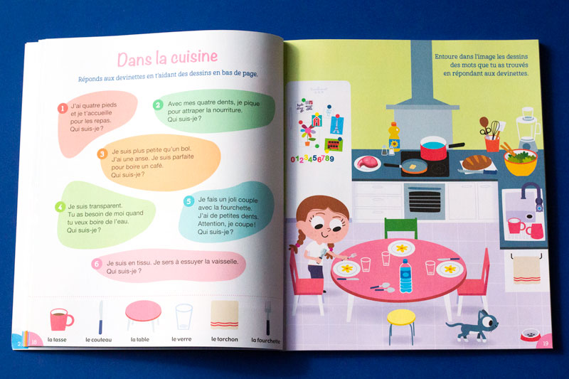 Dans chaque thème, 6 mots sont à découvrir sous forme de devinette, avec une phrase interrogative à la première personne. « Nous sommes faits de laine ou de cuir. Nous protégeons les mains du froid l’hiver. Qui sommes nous? », « J’ai un beau ballon multicolore et une nacelle. Je m’envole doucement dans le ciel grâce à de l’air chaud. Qui suis-je? ». Très Question pour un champion, n’est-ce pas? Une petite frise de bas de page propose les réponses illustrées en guise d’indice pour aider les plus petits.