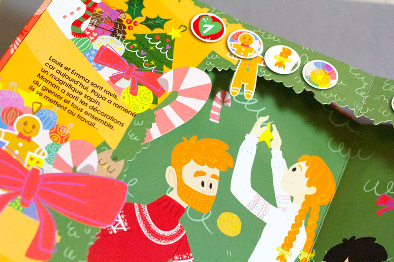 A partir de 3 ans • Ce petit bijou de Noël est le « cherche et trouve » ultime dans sa catégorie. Chaque page tournée révèle une des 5 magnifiques scènes en 3D façon pop-up sur le thème de Noël: la déco du sapin, les petits chalets du marché de Noël, l’emballage des cadeaux, la préparation de la table et du repas de fête et enfin, le passage discret du Père Noël pendant le réveillon. Dans les illustrations de ces 5 temps forts, le petit lecteur est invité à chercher chaque fois 8 éléments de détail du décor: un morceau du motif du tablier de maman, une déco du sapin, un panier rempli de Santons au marché de Noël ou encore la bûche au chocolat. Certain se cachent un peu dans les recoins du pop-up, donc il y a du challenge pour les tout-petits, d’autant que le format est assez grand et laisse toute la place à la chasse aux détails.